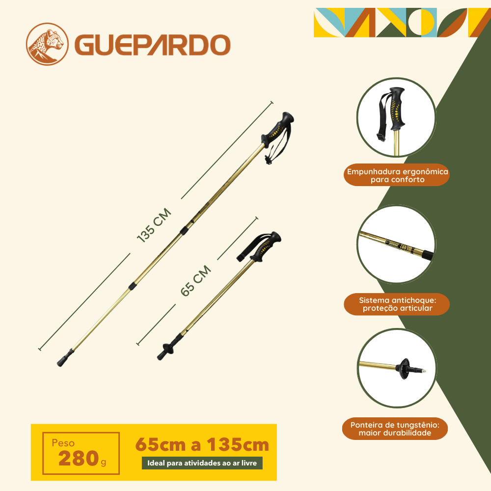 Se você é um aventureiro que busca explorar a natureza com confiança e segurança, o Bastão Guepardo é a escolha certa. Seu sistema antichoque e manopla soft grip garantem conforto e proteção durante as caminhadas mais desafiadoras. Com um design leve e altamente resistente, ele proporciona o suporte necessário para proteger suas articulações, ajudando a reduzir a tensão e o cansaço, especialmente em terrenos irregulares e aclives.